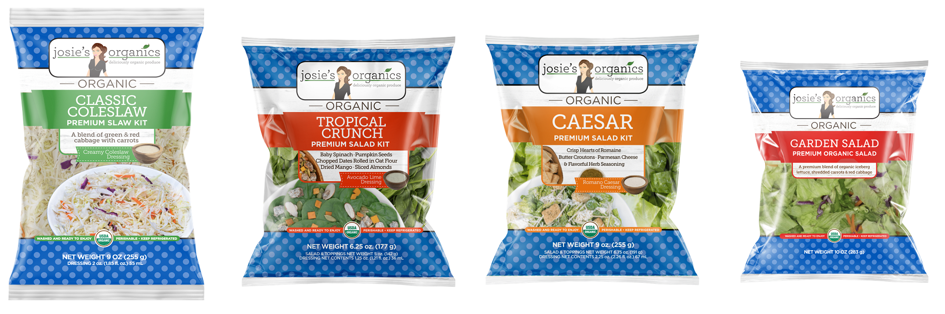 The organic Classic Cole Slaw is a 9-ounce blend of red and green cabbage, carrots and a creamy dressing and the organic Garden salad is a blend of organic Iceberg lettuce, shredded carrots and red cabbage in a 10-ounce package.