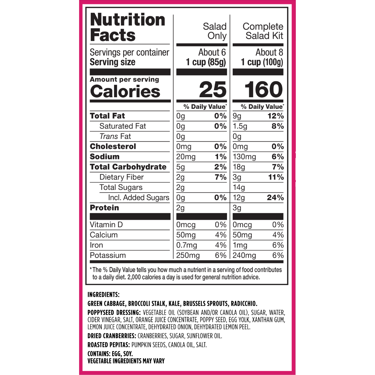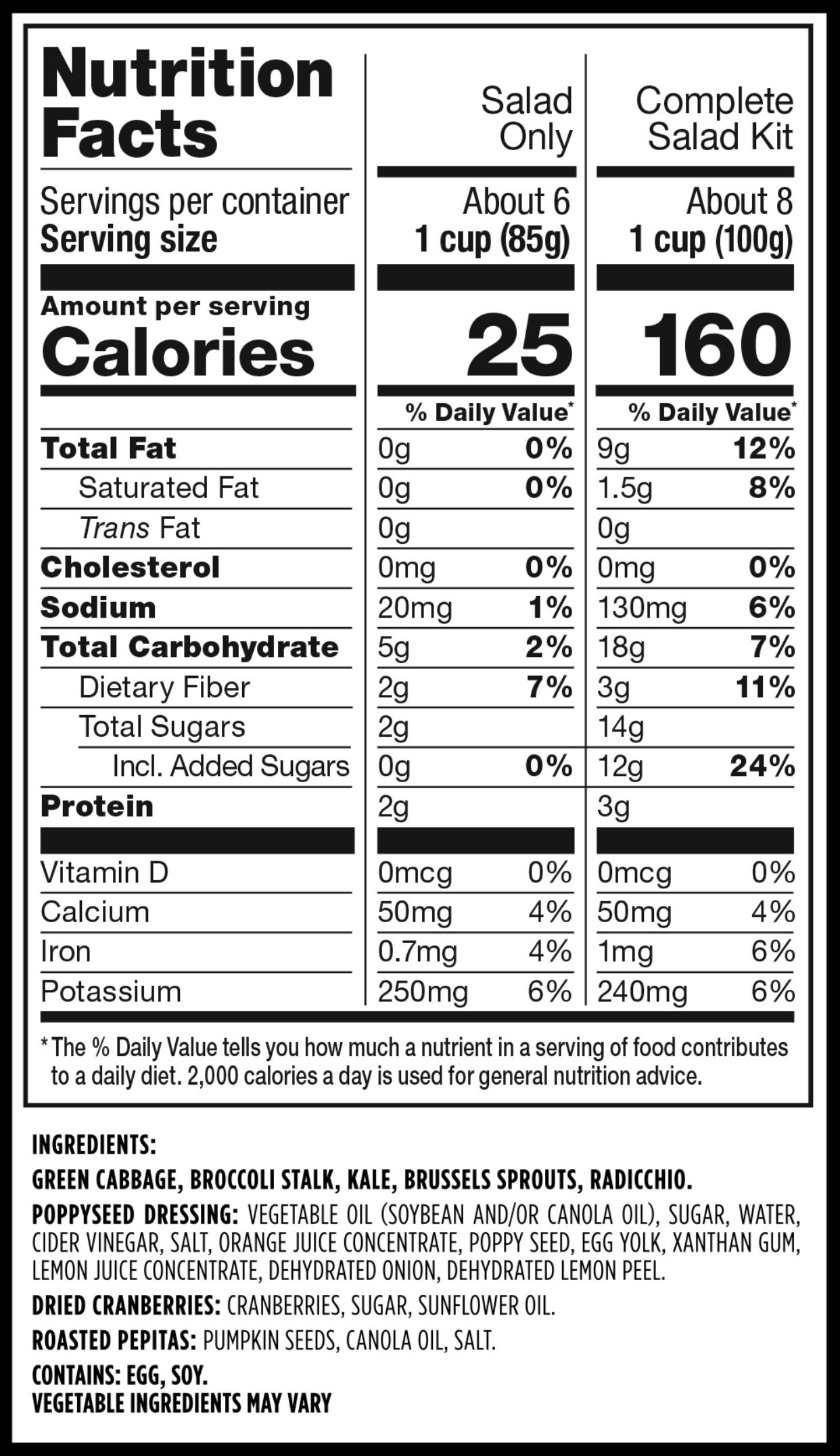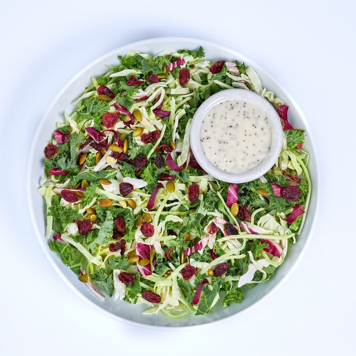 Broccoli, green cabbage, kale, dried cranberries, radicchio, pumpkin seeds, poppyseed dressing come together for a satisfying mix.