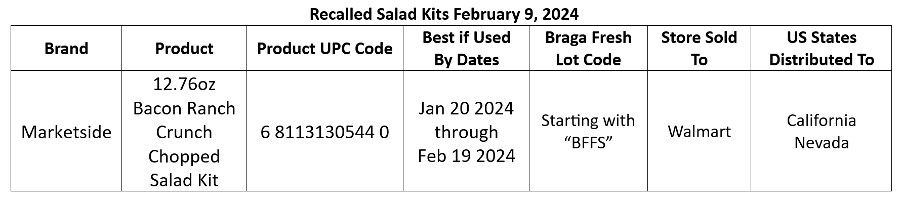 The recalled product, Marketside Bacon Ranch Crunch Chopped Salad Kits were distributed to a limited number of Walmart stores in California and Nevada and can be identified with listed details below. All affected products have been removed from store shelves and inventory.
