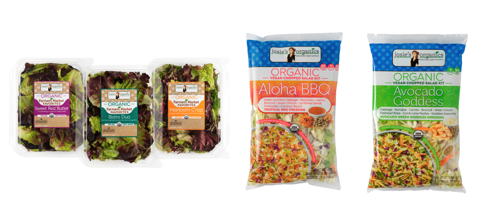 The Organic Avocado Goddess chopped salad kit contains fresh herb notes with a creamy avocado dressing, crunchy flatbread strips and a zingy goddess seasoning packet that is the key to the overall eating experience, Tuggle said. Both chopped salad kits are vegan, certified organic and contain clean salad dressing and component ingredients.